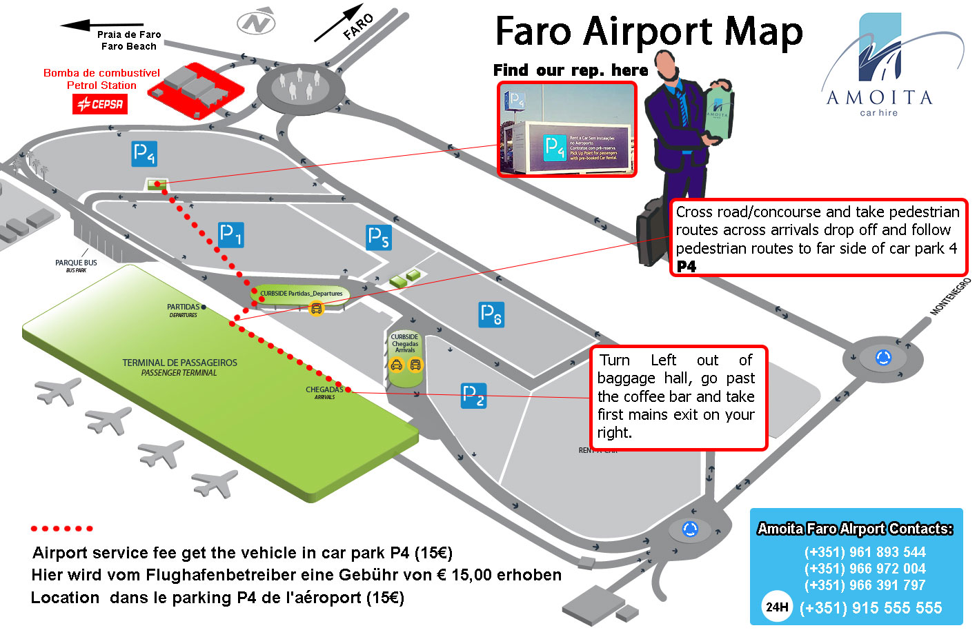In this map you will find indications where to meet our Reps in Faro International Airport. After passing the arrivals gate turn left and follow the hallway in the departures direction till you find the ground floor bar (Faro Airport Café). We'll be waiting close to the Information Desk holding a clipboard with your name. In case you don't find us please dial (+351) 966597506.